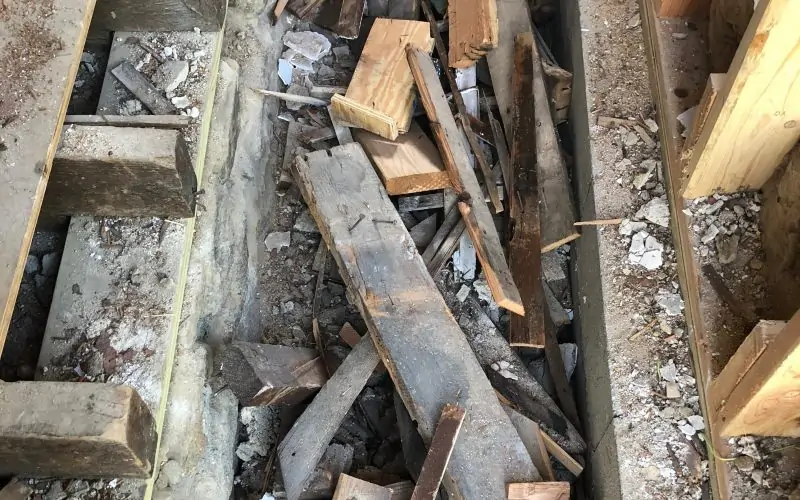 I love this image of broken bits of the old wood, and offcuts of the new, collected in a gulley between the original and newly constructed