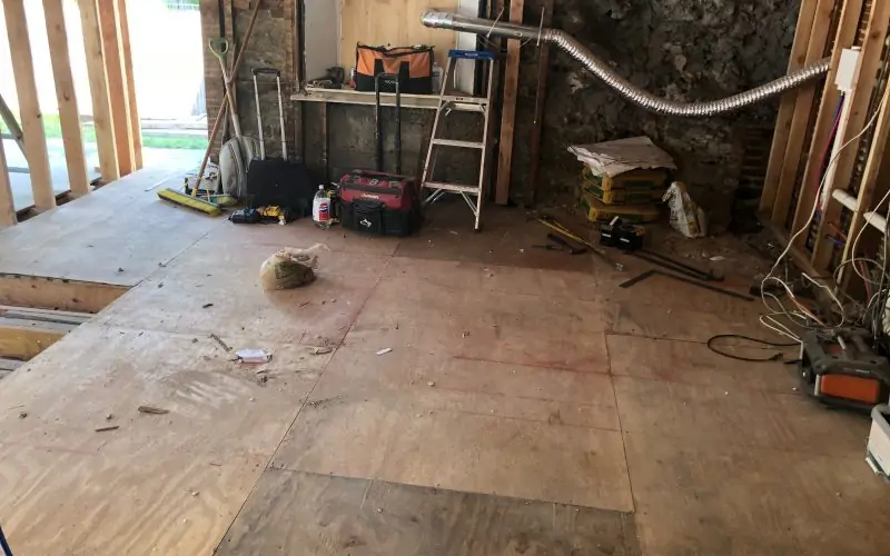 The plywood base is going down. I can no longer see into the basement from the kitchen. Yay!