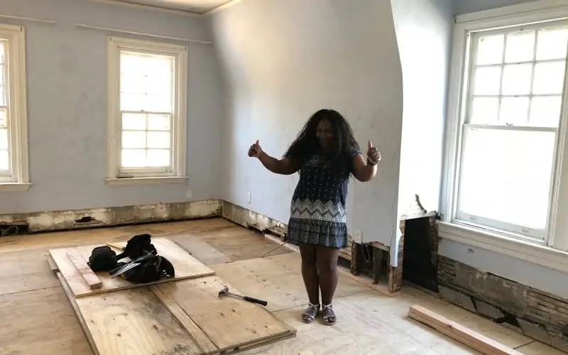 Here is Carolene helping me celebrate the fact that the master bedroom has a floor again. And here’s what it looked like moments before, as viewed