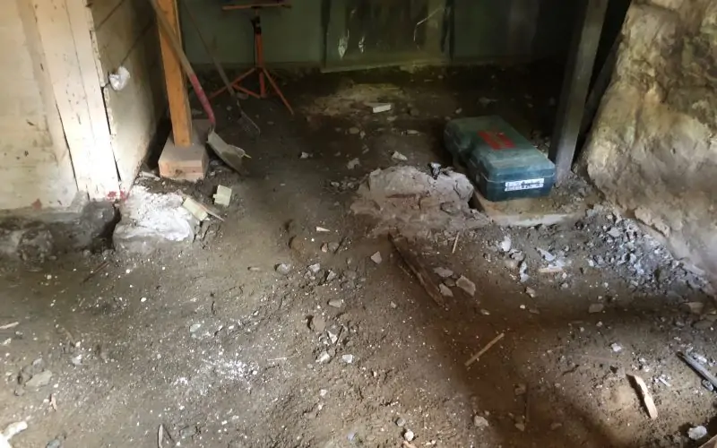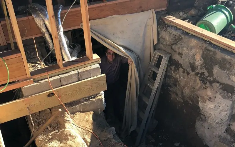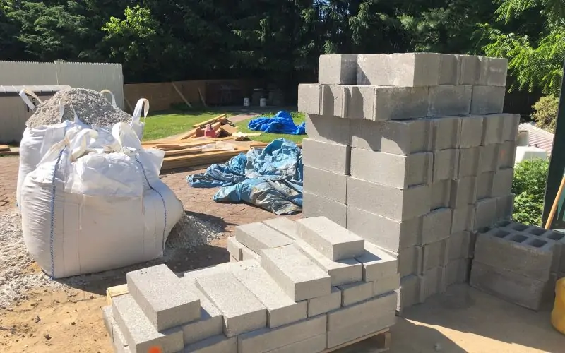 Concrete and breeze blocks are on hand to build the stairwell as soon as they’re through the wall.
