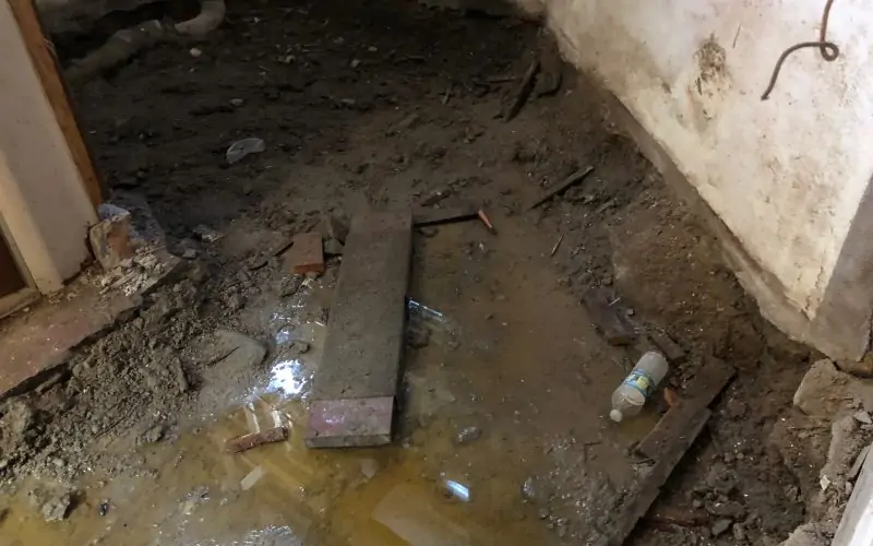 The original concrete floor is coming up, in preparation for the rerouting of the soil pipe then laying of a lovely new floor. It was much