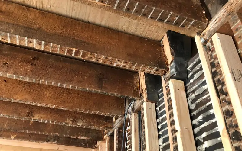 With the new bedroom floor joists in place, the MPC guys had an elegant way of levelling the kitchen ceiling. They nailed temporary supports along the